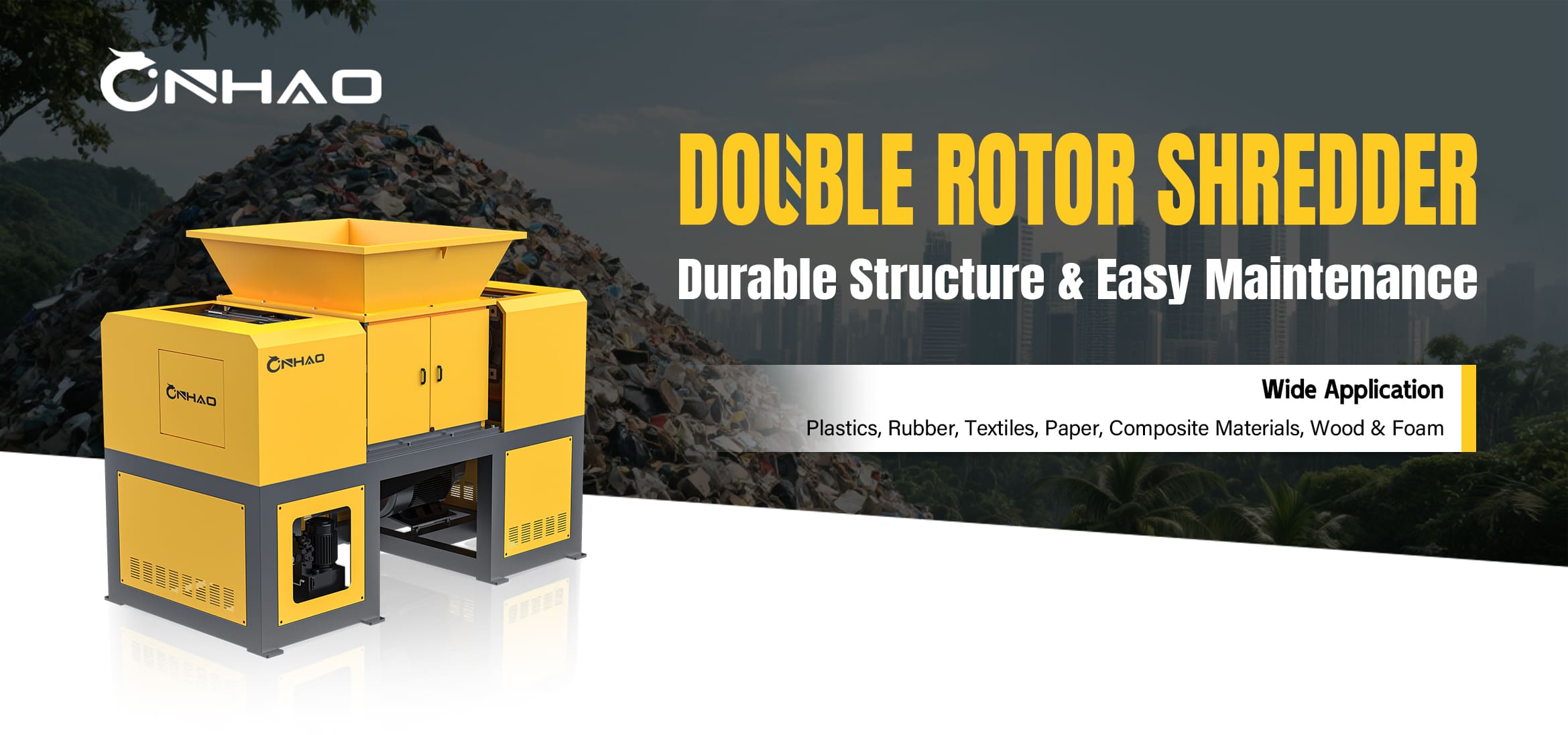 - Double rotor shredder main unit:Equipped with wear-resistant alloy blades and a low-speed, high-torque motor.